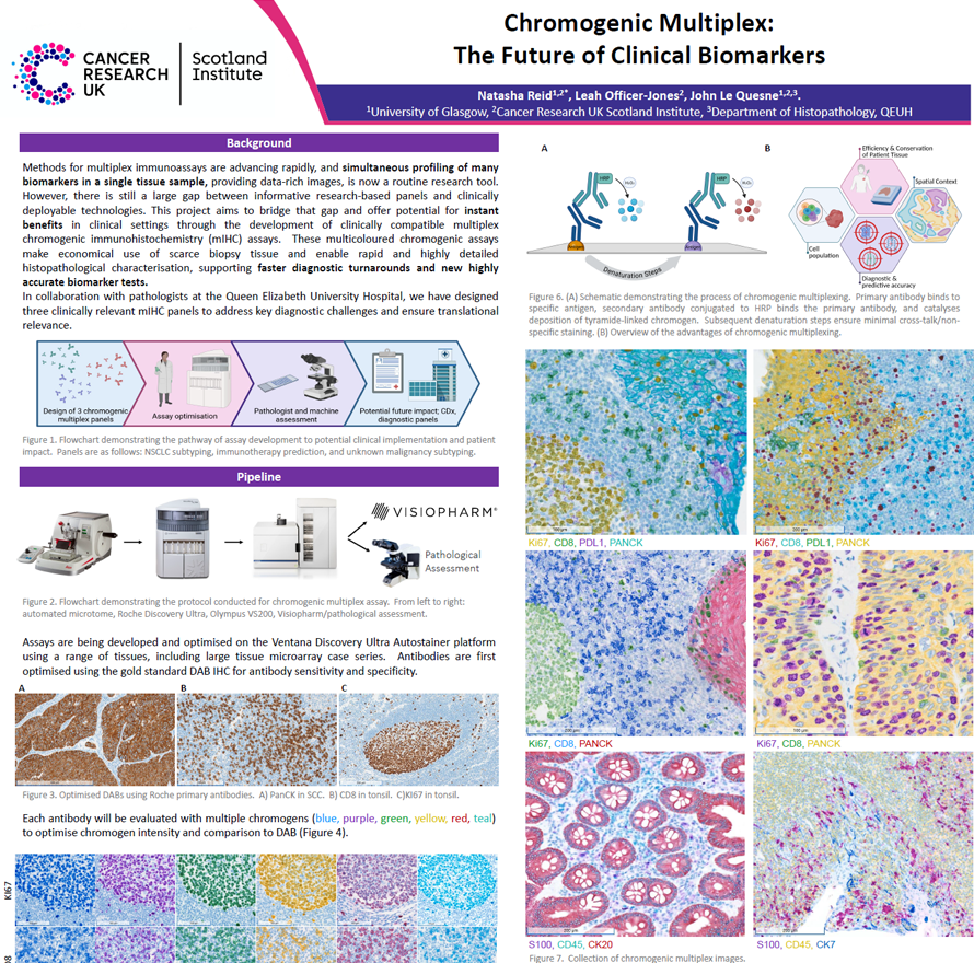 The poster presents the development of chromogenic multiplex immunohistochemistry (mIHC) assays designed for clinical use. It highlights how multicolored chromogenic staining enables simultaneous profiling of multiple biomarkers in a single tissue sample, improving diagnostic accuracy and turnaround times. The work focuses on creating clinically relevant panels for lung cancer subtyping, immune engagement, and poorly differentiated malignancies, aiming to bridge the gap between research tools and routine clinical workflows for next-generation biomarker testing.