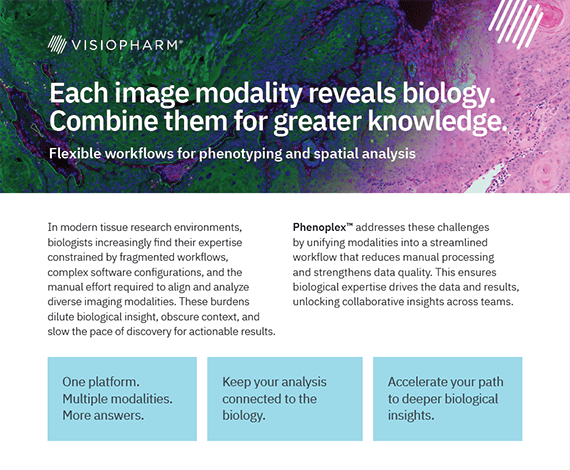 Phenoplex™ is Visiopharm’s end‑to‑end software solution for multiplex spatial biology analysis, enabling researchers to confidently visualize, segment, phenotype, and explore complex high‑plex tissue images within a single guided workflow. Built on AI‑powered cell detection and interactive verification steps, Phenoplex helps uncover meaningful biological insights, compare cohorts, and reproduce results across any plex level and imaging technology.